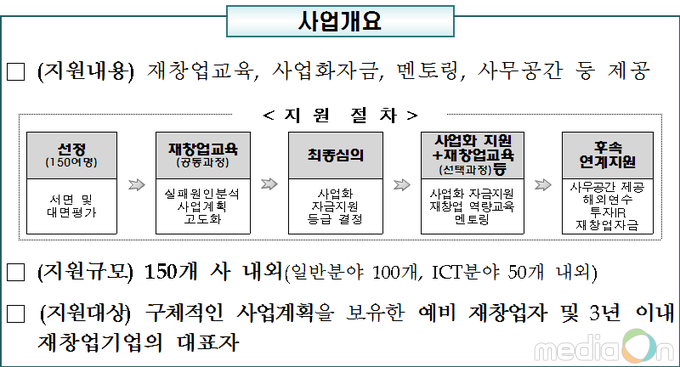 지원대상은 예비재창업자이거나 재창업 3년 이내인 기업의 대표자로 신청을 희망하는 (예비)재창업자는 K-스타트업(www.k-startup.go.kr) 및 재도전종합지원센터(www.rechallenge.or.kr)를 통해 신청하면 된다.