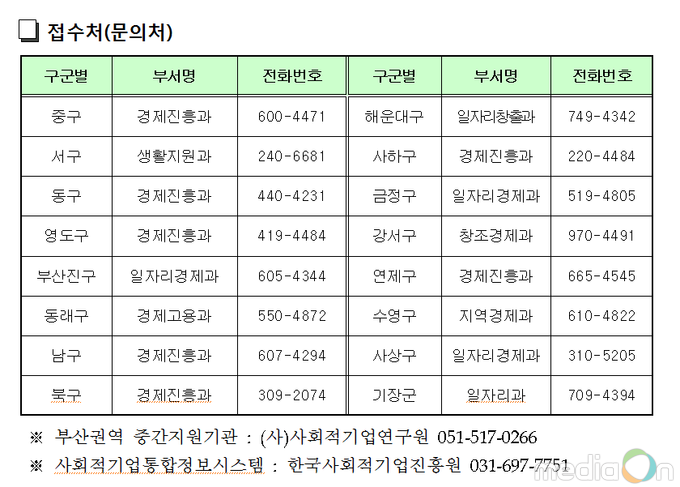 (미디어온) 부산시는 취약계층에게 안정적인 일자리를, 지역 주민에게는 양질의 사회서비스를 제공하기 위한 ‘2016년 제1차 예비사회적기업 지정 및 일자리창출사업’ 공모를 실시한다고 밝혔다.