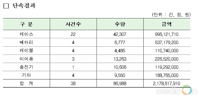 적발 내용을 보면 위조 상표 휴대폰 케이스가 22건(적발수량 42,307점)으로 가장 많았으며, 보조 배터리가 4건(적발수량 6,777점), USB케이블 4건(적발수량 4,485점), 이어폰 3건(적발수량 13,263점), 충전기 1건(적발수량 10,606점), 기타 4건(9,550점) 등 총 38건(적발수량 86,988점)으로 정품가격으로는 22억원 상당이었다.