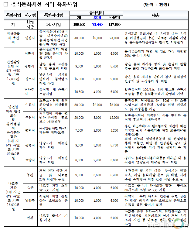(미디어온) 경기도가 음식문화 개선과 외식산업 활성화를 위해 도내 각 시군을 대상으로 음식문화 특화사업을 추진한다고 전했다.