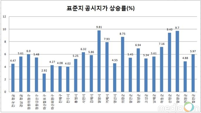 도내의 표준지 공시지가 상승률은 밀양시(9.81%), 함양군(9.7%), 산청군(9.43%) 순으로 높았으며, 창원시 마산합포구(2.92%)가 가장 낮았다.