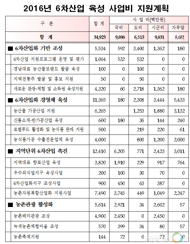 (미디어온) 경상남도는 농촌지역의 농산물·자연·문화 등 유형·무형의 부존자원과 식품가공, 유통·관광·서비스업 등 1·2·3차 산업을 융복합하여 새로운 부가가치를 창출하고 농업인들의 소득 증대 및 농촌지역 경제 활성화는 물론, 농업·농촌사회의 발전을 도모하기 위하여 올해 349억 원을 투입하는 “2016년 경상남도 6차 산업 육성 시행계획”을 마련해 추진한다고 밝혔다.