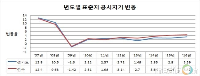 22일 도에 따르면 2016년도 경기도 표준지 공시지가는 전년보다 3.39% 올라, 전년도 상승률 2.8%에 비해 상승폭이 다소 증가했다.