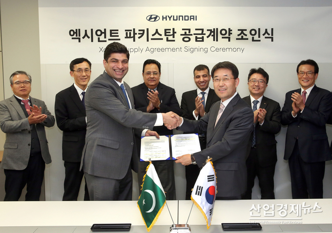 현대차는 지난 9일 양재동 본사에서 상용수출사업부 이인철 전무, 파키스탄 현대차 상용 대리점 '알하즈 현대'의 빌랄 사장 등이 참석한 가운데 대형트럭 엑시언트 200대 공급 계약을 체결했다고 10일 밝혔다.