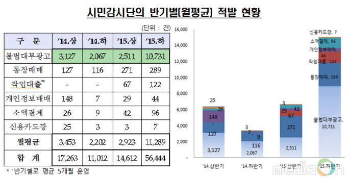 시민감시단이 5개월간 제보한 건수는 기존 감시단의 총 활동 기간 동안 적발한 수치보다 31.6% 증가한 수준으로 시민감시단의 구성인원증가, 전국적으로 고른 지역적 분포 등으로 제보활동이 활발해져 월평균 적발건수도 지난 2015년 상반기에 367%상승했다.