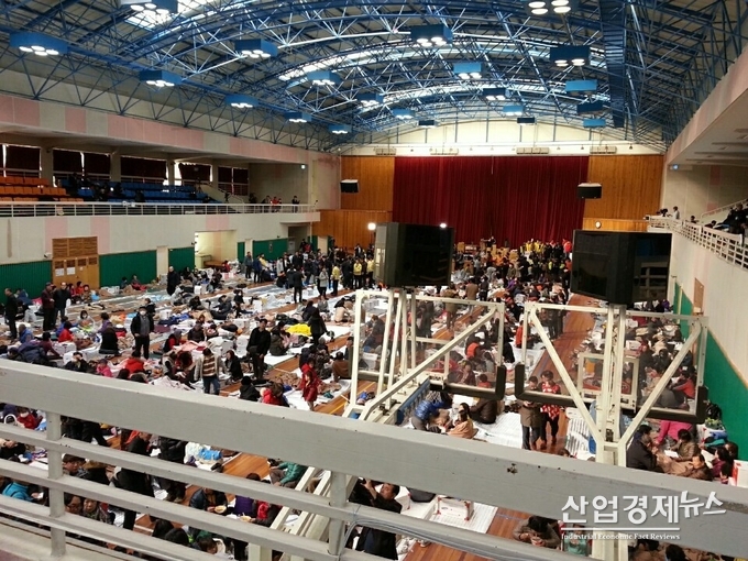 IBK 기업은행과 한국자원봉사센터협회가 15일 오후 발생한 규모 5.4의 강진으로 부상자와 이재민이 발생한 경북 포항시의 비상 대피소에 ‘참! 좋은 사랑의 밥차’를 긴급 파견하여 식사 등을 제공하였다.
