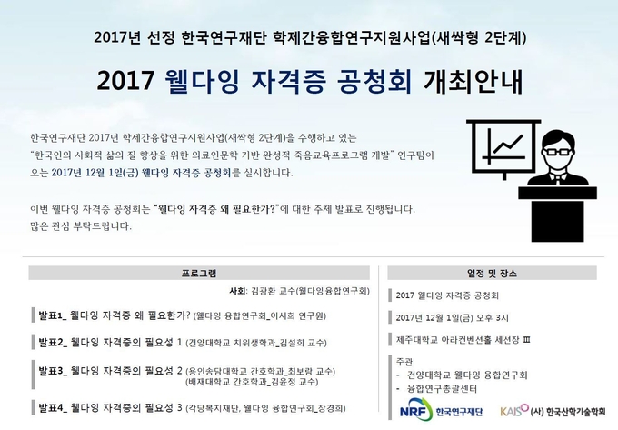 한국연구재단 융합연구총괄센터(센터장 노영희 교수/지식콘텐츠연구소 소장)와 건양대학교 웰다잉 융합연구회가 12월 1일 금요일 오후 3시 제주대학교 아라컨벤션홀 세션장 3에서 ‘웰다잉 자격증 왜 필요한가?’라는 주제로 웰다잉 자격증 공청회가 열린다.