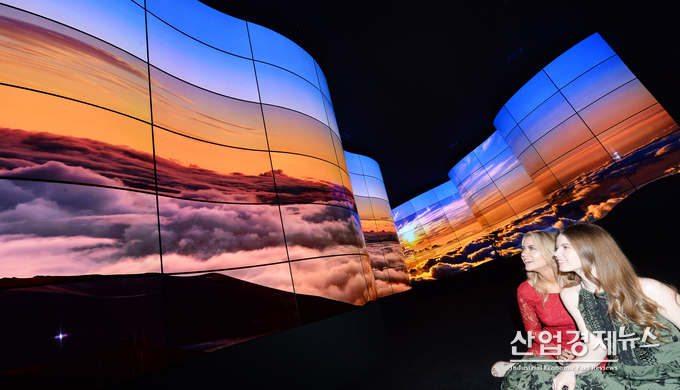 LG전자는 전시장 입구에 길이 16m, 너비 16m, 높이 6m 공간을 마련했다. 가운데 구부러진 길을 만들고 길 양 옆에 마치 협곡처럼 올록볼록한 모양으로 올레드 월을 세웠다. 관람객들은 28m에 달하는 길을 걸으며 총 20억개 올레드 자발광 화소가 만들어내는 환상적인 영상을 경험할 수 있다.