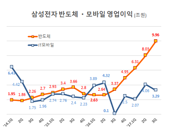 증권가에선 스마트폰 사업을 하고 있는 IM부문이 지난 4분기에 약 2조6000억~2조9000억원 수준의 영업이익을 기록했을 것이라는 예상을 내놓고 있다. 3년 전만해도 6조원 수준의 분기 이익을 냈지만 2014년 후반부터 감소해서 지금까지 좀처럼 2~3조원 수준을 넘어서지 못하고 있다.