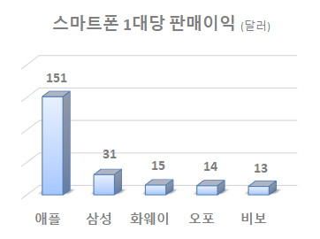 스마트폰 시장조사업체 카운터포인트리서치에 따르면 지난해 3분기 스마트폰 시장에서 애플은 스마트폰 1대 당 151달러의 수익을 낸 것으로 조사됐지만 삼성은 31달러로 애플의 5분의 1 수준에 그쳤다. 애플은 3분기 세계 스마트폰 시장 이익의 59.8%를 가져갔다는 통계도 나오고 있다.