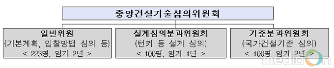 “중앙건설기술심의위원회”는 건설기술진흥법 제5조에 따라 건설기술의 진흥·개발·활용 등에 대한 정책결정 및 심의를 수행하는 우리나라 최고의 심의기관으로, 국토교통부 제1차관을 위원장으로 전체 423명으로 구성되며, 건설기술 관련 심의와 입찰방법심의 등을 담당하는 일반위원, 일괄입찰(턴키) 등 설계심의를 담당하는 설계심의분과(100명)와 국가건설기준 심의를 담당하는 기준분과(100명) 등으로 구성된다.