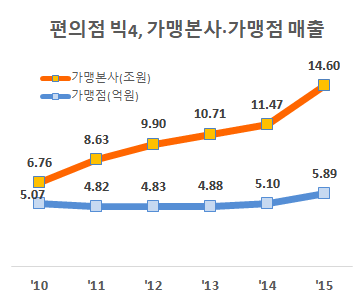 지난해 국회 정무위원회 제윤경 의원이 공정거래위원회로부터 제출받은 자료를 분석해 보면 가맹본사와 가맹점주의 매출과 이익 증가율이 현격한 차이를 보인다. 이 자료에 따르면 대표적인 프랜차이즈 업종인 편의점 가맹본사 4곳의 매출액은 2010년 6조7621억원에서 2015년 14조5953억원으로 5년 사이 두 배 이상 증가했다.