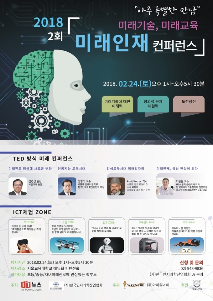 인공지능과 로봇이 우리 옆으로 성큼 다가오면서 앞으로 우리가 살아가야할 미래에 대한 궁금증이 높아지는 가운데 미래인재육성을 위한 컨퍼런스와 ICT 기술을 직접 체험해 볼 수 있는 행사가 개최된다.