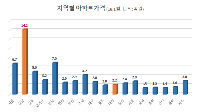 한국감정원의 전국 아파트 가격 추이를 보면, 올해 1월 현재 서울 강남구의 아파트는 평균 14억원을 넘어 섰다. 아파트에 따라 재건축이라도 걸려 있으면 20억원 내외를 호가하는 아파트도 적지 않다.