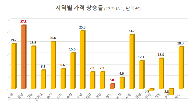 2014~2015년 부동산 열기가 시작될 때만해도 서울과 지방 상승률은 크게 차이가 나지 않았고 대구, 세종, 제주 등 지역은 왠만한 수도권 지역보다 상승폭이 더 크기도 했다. 하지만 2016년을 지나 폭발적 상승세가 조금씩 잠잠해 지면서 서울과 지방의 상승폭이 점차 확연히 갈리기 시작했다.