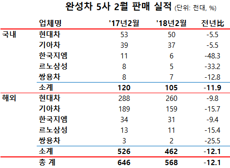 지난 2월, 완성차 5사의 판매량은 내수와 수출 동반부진으로 지난해 2월 보다 12.1% 감소한 실적을 보였다. 내수판매는 10만5천대로 1만5천대가 줄어들어 11.9% 감소했지만, 해외판매는 46만2천대로 6만4천대 12.1%가 감소해 해외부진이 전체 판매부진의 주요 이유로 나타났다.