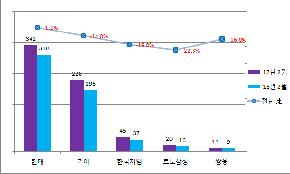 2월 지역별 판매량은 내수가 5천353대, 수출이 1만641대로 각각 33.2%, 15.4% 씩 뒷걸음질 쳤다.