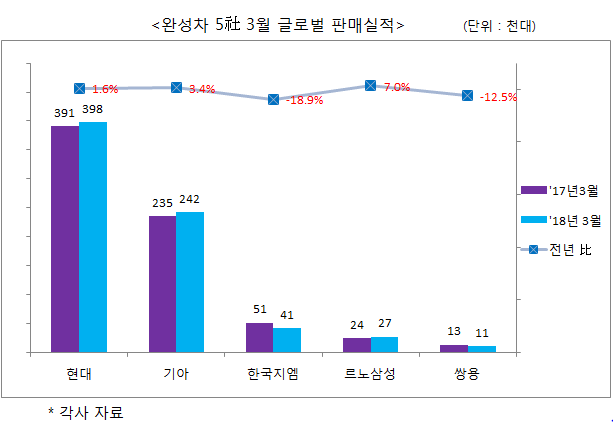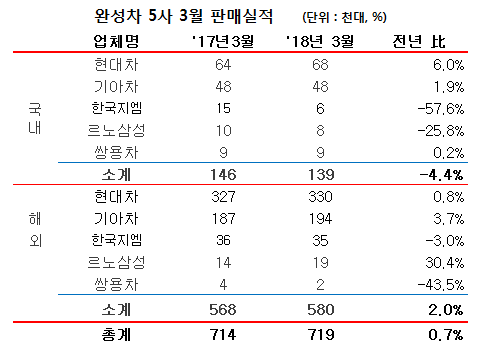 [엔트로피타임즈 김대성 기자] 현대자동차, 기아자동차, 한국지엠, 르노삼성, 쌍용자동차 등 완성차 5사의 지난 3월 총 판매량은 71만9천대로 지난해 같은 달보다 0.7% 증가했다.