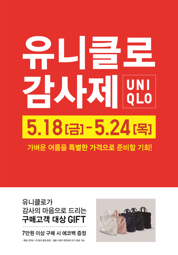 이 행사는 올해도 ‘에어리즘’, ‘프리미엄 리넨 셔츠’, ‘감탄팬츠’ 등 가벼운 여름을 위해 꼭 필요한 상품들을 할인하여 특별가에 선보인다. 18일부터 일주일간 진행되며, 총 2회(18일~21일, 22일~24일)에 걸쳐 기간마다 할인 구성을 달리하여 혜택의 폭을 더욱 넓혔다. 또한 7만원 이상 구매 고객에게 선착순으로 에코백을 증정하는 등 풍성한 혜택을 마련했다.