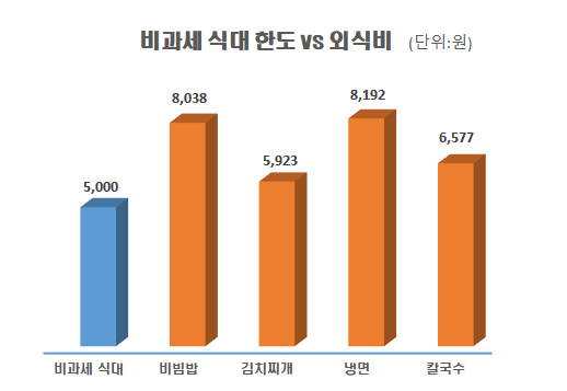 한국경제연구원이 행정안전부 물가정보를 토대로 파악한 지난해 12월 기준 서울의 외식비 가격은 비빔밥의 평균가격이 8038원, 김치찌개가 5923원, 냉면 8192원, 칼국수가 6577원이다. 현행 비과세 식대 5000원보다 20~60% 비싸다.
