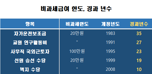 이밖에도 교원이나 연구원들이 받는 연구활동비 한도도 1991년에 개정된 후 27년 동안 오르지 않았고, 사무직 국외근로자의 비과세 한도도 1995년 100만원으로 개정된 후 23년 동안 그대로다. 선원 승선수당도 19년 동안 그대로고 직원들이 산간도서 지역에 근무할 때 받는 벽지수당도 10년 동안 20만원에서 한푼도 오르지 않았다.