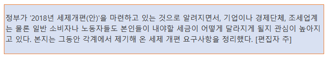기획재정부 세제실과 국세청은 매년 세법개정(안)을 작성해 9월 정기국회에 제출한다. 이를 위해 현재 각계 각층의 의견을 수렴하고 있는 것으로 전한다.