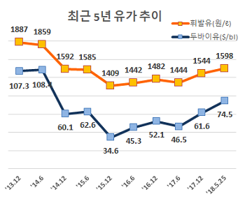 두바이유는 2015년 배럴당 34.6달러까지 급락한 이후 2016, 2017년 그리고 올해 까지 계속 상승세를 이어가고 있다.