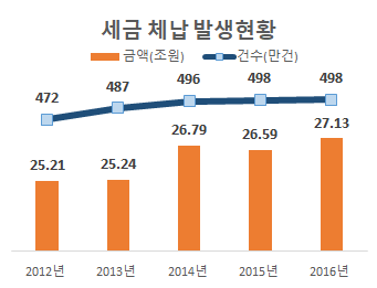 지난 2012년부터 2016년까지 세금 체납현황을 보면 체납 건수도 체납 금액도 전혀 줄지 않았고 오히려 매년 늘어나고 있는 추세다. 조세전문가들은 현행 가산세와 감면 규정이 납세자의 성실납부를 유도하지 못하고 있는 것으로 분석하고 있다.