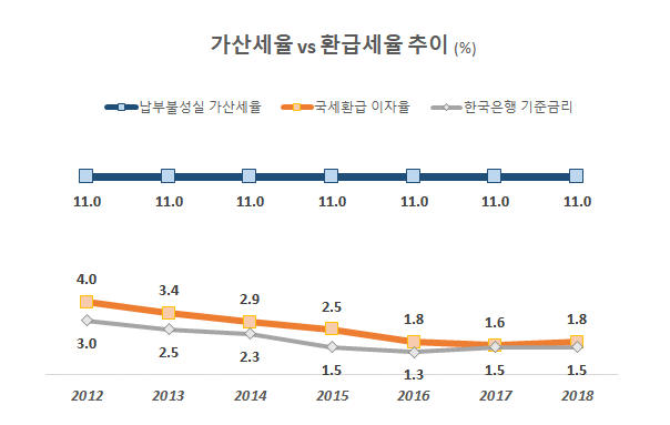 지난 6년 사이 기준금리는 3.0%에서 1.5%로 절반으로 떨어졌고 환급 이자율은 4.0%에서 1.8%로 절반 이하로 떨어졌지만 가산세 이자율만 지금보다 금리가 2배나 높았던 2012년 수준을 그대로 유지하고 있다.