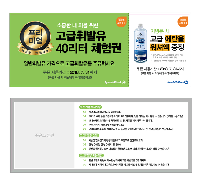 쿠폰은 오는 7월말까지 사용이 가능하다. 쿠폰 사용 기한까지 고급휘발유를 다시 구매한 고객에게는 고급에탄올 워셔액도 제공한다.