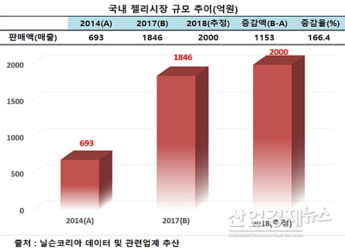 시장 조사전문기관 닐슨 코리아와 업계에 의하면 국내 젤리 시장 규모(매출)는 2014년 693억원에서 2017년 1천846억원으로 3년 새 약 2.6배 급성장했다. 젤리 시장이 큰 폭으로 성장하는 만큼 제품 경쟁도 치열해지고 있는 상황이다.