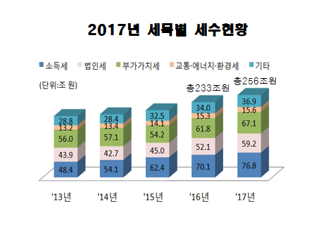 국세청 조기 공개자료에 따르면 2017년 국세는 모두 255조5932억원이 걷혔다. 2016년 233조3291억원 보다 9.5% 증가한 실적이다. 총국세 부과는 265조원이지만 그중 96.3%가 납부됐다.