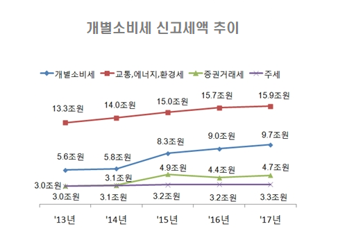 한편, 개별소비세는 9.7조원으로 '16년에 비해 7.8%가 증가했다. 교통에너지환경세는 15.9조원으로 1.3% 증가했고, 증권거래세는 4.7조원으로 6.8%, 주세는 3.3조원으로 3.1% 증가했다.