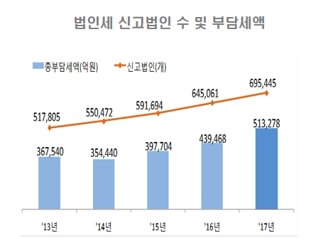 법인세 신고법인 수는 51만3278 개로 지난해 43만9468개 보다 17% 증가했다. 부담세액은 69.5조원으로 전년 64.5조원보다 7.8% 증가했다.