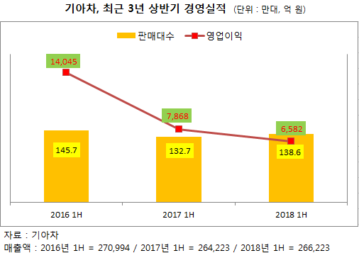 기아차는 지난달, 올 상반기에 △매출 26조6223억 원 △영업이익 6582억 원 △당기 순이익 7638억 원의 실적을 보였다고 발표했다.