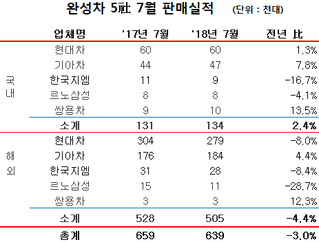 이들 5사의 지난달 자동차 총 판매량은 63만9천대로 전년 동월대비 3.0% 줄었으나, 누적으로는 지난해 고전했던 현대·기아차의 기저효과에 힘입어 1.9% 증가한 것으로 나타났다. 그러나 지난 상반기까지 상승세를 유지했던 현대차는 지난달 해외부문 부진여파로 6.5% 마이너스 성장세로 마감했다.