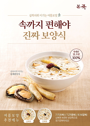 본아이에프 관계자는 “사상 최악의 폭염에 지쳤다면 빠르고 간편하게 원기회복을 할 수 있는 ‘퀵 보양식’을 추천한다”며 “본죽&비빔밥 카페의 보양죽 라인은 닭과 수삼, 전복을 활용해 풍부한 영양은 물론, 속까지 편한 메뉴로 기력 회복을 돕는 한 끼를 책임진다”고 소개했다.
