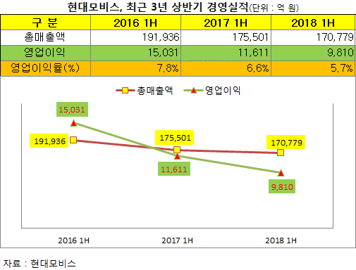 최근 모비스는 올 상반기 매출액 17조779억 원, 영업이익 9810억 원의 경영실적을 발표했다. 이는 전년 동기 대비 매출액은 2.7%, 영업이익은 15.5%가 각 각 줄어든 부진한 성적표다.