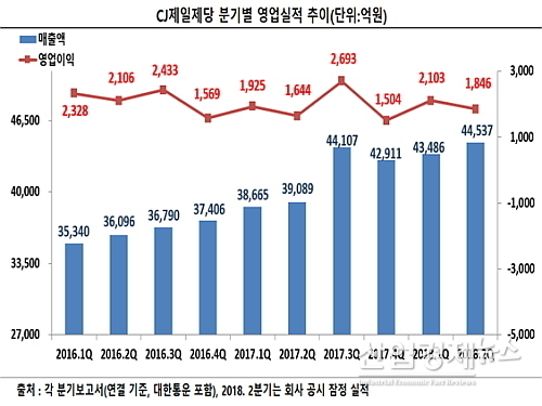 먼저 CJ제일제당은 지난 14일 반기보고서 공시를 통해 연결재무제표 기준 2분기 매출이 전년 대비 13.9% 증가한 4조4537억원, 영업이익은 12.3% 증가한 1846억원을 시현했다고 밝혔다.