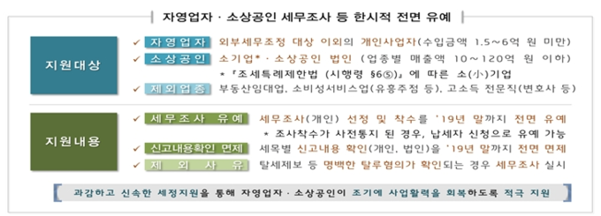 국세청은 "자영업자와 소상공인의 경제활력을 제고해서 국민경제에 온기를 확산"하겠다며, 각종 세제지원 대책을 마련했다.