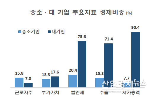 GDP에서 차지하는 비중도 중소기업이 13%, 대기업이 18%로 대기업이 다소 많긴 하지만 큰 차이를 보이진 않는다.