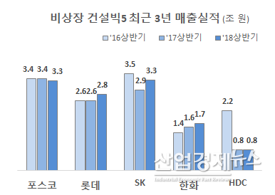 롯데건설도 신동빈 회장의 구속 등에도 불구하고 9%의 신장세를 보였고, 한화건설도 11조원 규모의 이라크 비스마야 신도시 공사가 최근 정치적 리스크가 해소되면서 매출 증가에 힘을 보탰다. 한화건설은 매년 꾸준한 증가세를 보이며 올 상반기에도 전년 동기대비 9% 성장세를 보였다.