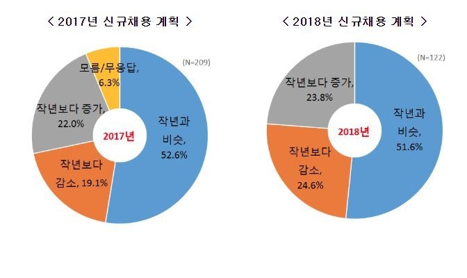신규채용을 늘린다고 답변한 기업들의 증원 이유는 '근로시간 단축으로 인한 충원'이 37.9%로 가장 많아 그나마 정부가 추진하고 있는 52시간 근무제의 취지가 반영된 모습이다. 이어서 경기상황 개선 31.0%, 인재확보 24.1% 등을 신규채용을 늘리는 이유로 꼽았다.