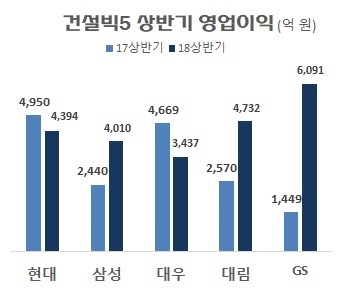 올 상반기 건설사들의 영업이익을 살펴보면, GS건설이 6091억원으로 1 등으로 올라섰다. 이어서 대림산업이 4732억원으로 2위, 현대건설이 4394억원으로 3위를 했다.