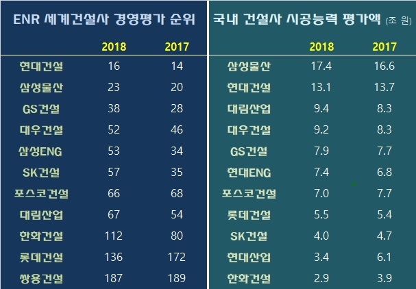 삼성물산이 23위로 국내 건설사 가운데에서는 두 번째로 높은 순위를 기록했으며 뒤를 이어 GS건설, 대우건설이 각각 38위, 52위에 랭크됐다. 한국 건설사들은 포스코 건설과 롯데건설, 쌍용건설이 순위가 상승했지만 상위에 랭크된 회사들은 모두 순위가 뒤로 밀렸다.
