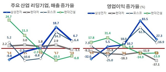 2014년 이후 2016년 까지 이들의 매출·영업이익 증가율을 보면 삼성전자 포스코 마저 마이너스 성장률을 보이거나 성장률이 크게 감소하는 등 부진한 실적을 보였다. 2017년에 와서야 삼성전자와 포스코는 큰 반전을 보인 반면 현대자동차와 현대건설은 올해까지 여전히 계속되는 부진을 이어가고 있다.