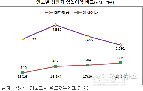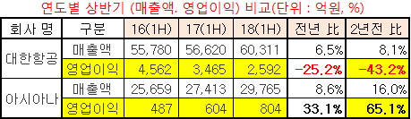 반면, 아시아나의 경우, 같은 기간 –140억 원(영업손)에서 → 487억 원(2016.1H) → 604억 원(2017.1H) → 804억 원(2018.1H)으로 매년 꾸준한 증가 덕에 2년 새 65.1% 성장세를 가속화를 하고 있어, 급락세를 연출중인 대한항공과 대조를 보였다.