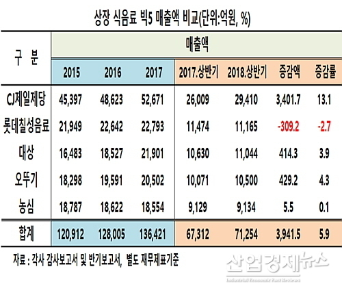 1위 CJ제일제당은 2015년 4조5397억, 2016년 4조8623억, 지난해 5조2671억 원의 매출로, 별도기준 첫 5조원 대를 돌파하는 성장세를 기록, 독주를 지속하더니, 올 상반기에도 5개사 중 가장 높은 13.1% 성장하며 2조9410억 원의 매출을 시현, 독주 체제를 가속화했다.
