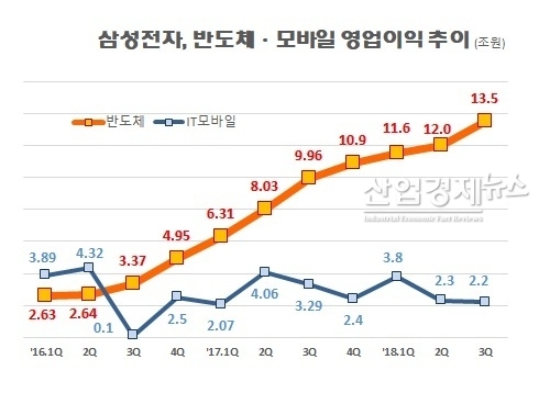 [엔트로피타임즈 문성희 기자] 삼성전자의 사업구조에 경고등이 들어왔다. 삼성전자는 이번 3분기 17.5조원의 영업이익을 내며 또다시 신기록행진을 이어갔다. 하지만 주력제품인 반도체와 스마트폰의 영업실적이 갈수록 벌어지는 양극화 현상이 심화되고 있어 전문가들은 주의를 촉구하고 있다.