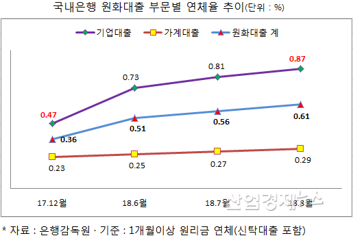금융감독원 조사에 따르면, 지난 8월말 현재 국내은행 원화대출 연체율은 0.61%로 지난해 말과 직전 월인 7월 보다는 0.25%p, 0.05%p가 각각 증가해 올해 들어 가파른 상승세를 이어가고 있다.